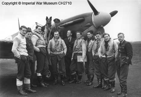 Pilots of 54 Squadron in front of a Spitfire IIA at Hornchurch's satellite field at Rochford. On th ewing is Squadron Leader RF Boyd and the squadron mascot "Crash" in front of Boyd is Flying Officer Snowden-Stapleton