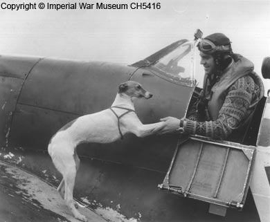 The Czech pilot V.Jicha of 313 "Czech" Squadron is greeted after a sortie by his dog Jara